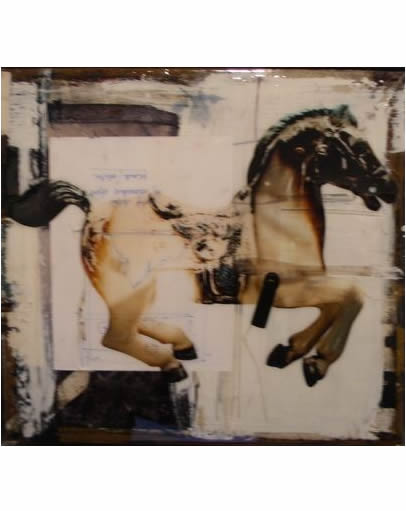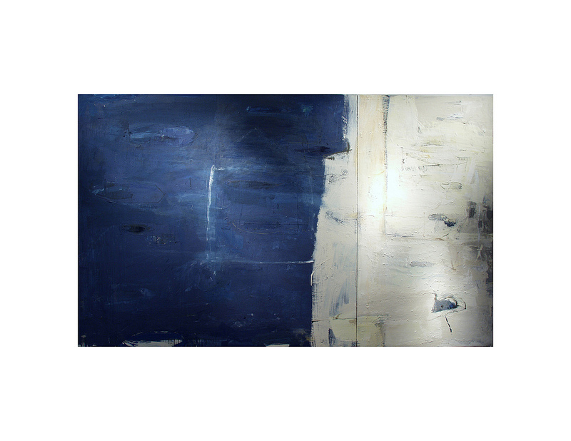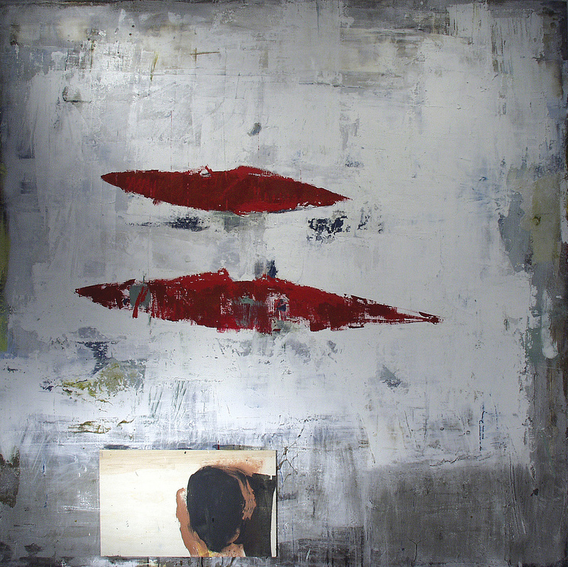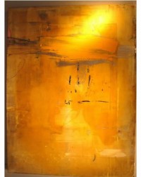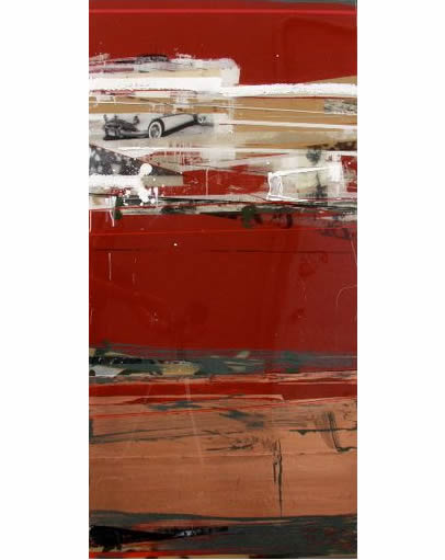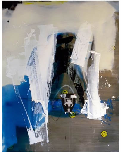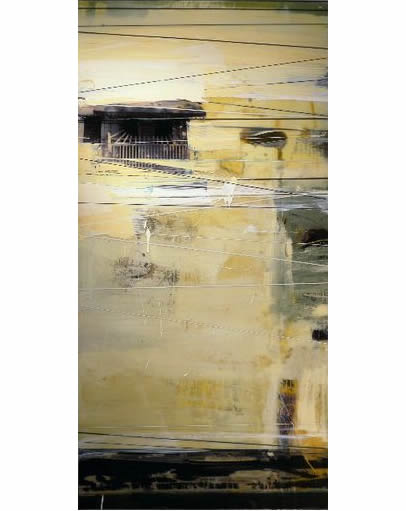 On a purely physical level, the paintings also reveal a divergence. They are built up out of layers of materials: found objects, industrial paints, varnishes, resins, acrylics, oils, woodcut inks, pencil markings, films, wires, threads, etc. This range of materials is employed through a variety of techniques including collage, monotype and gestural markings. Open to both experimentation and unorthodox materials, the paintings maintain a gritty urban edge and the spontaneity of everyday living. It is important that the manner in which these paintings are constructed is never obscured. All the layers that make up the paintings manage to peek through the surface at some point, as though this surface is a skin that envelops the cumulative process of production without hiding it.