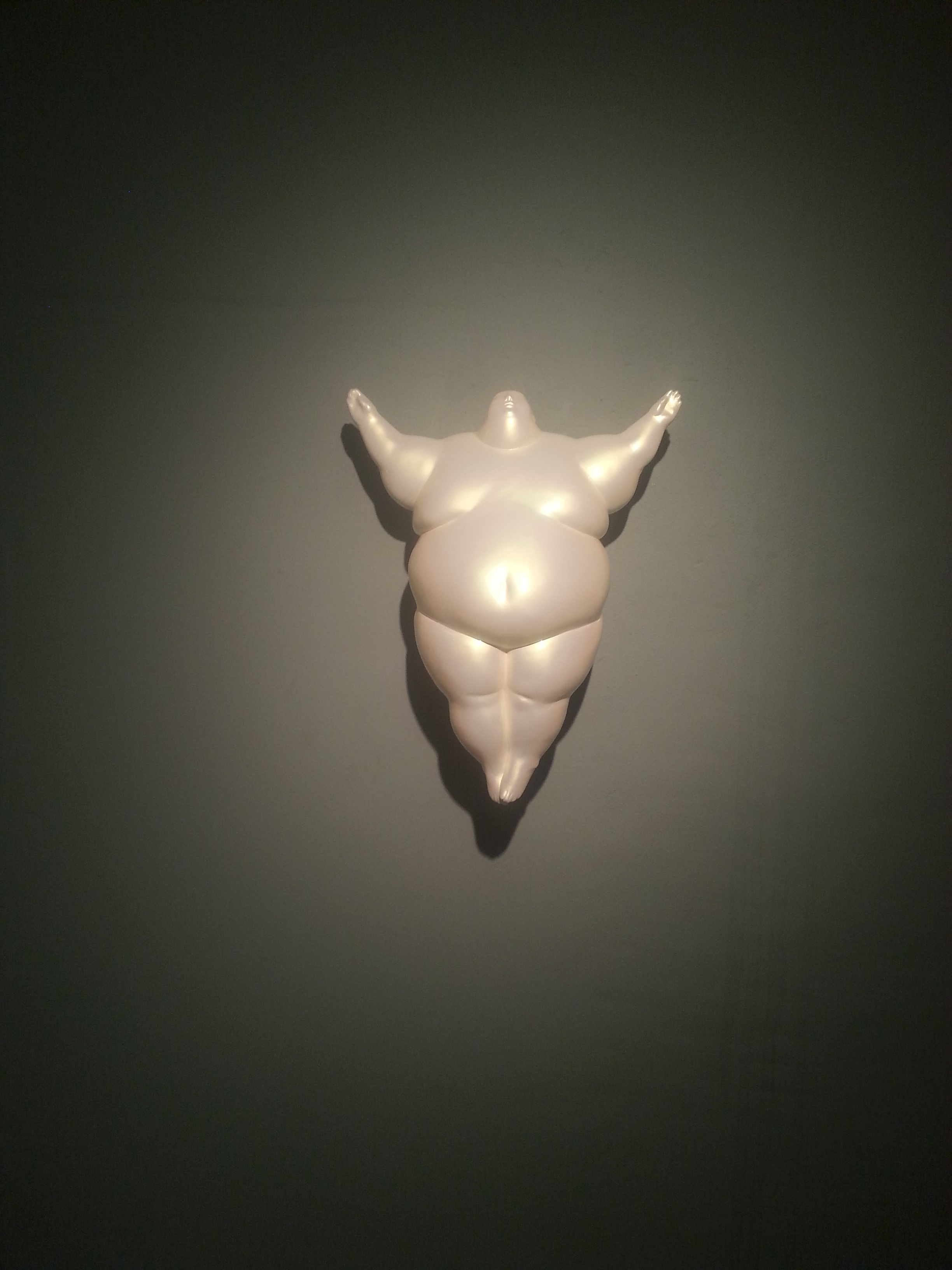 On the wall opposite, viewer feels as though he beholds an answer: A porcelain-looking baby by Emil Alzamora caught eternally in the glow of a spot light. But it’s a fat baby, or a miniature sumo wrestler with his arms uplifted in heavenly grace. From outside the room, the piece is framed by the rectangular outline of the wall. It’s not completely clear to me how this resolves the mystery of Vasily Kafanov’s painting-installation, but the sequence of discovering how both works face each other across the long space makes an impact.