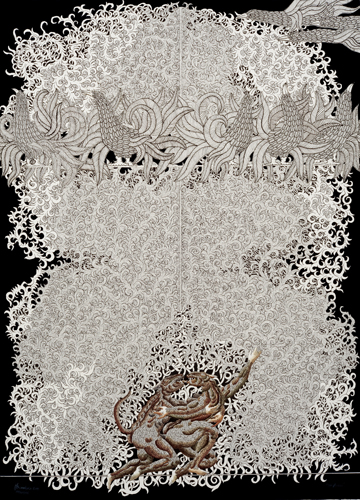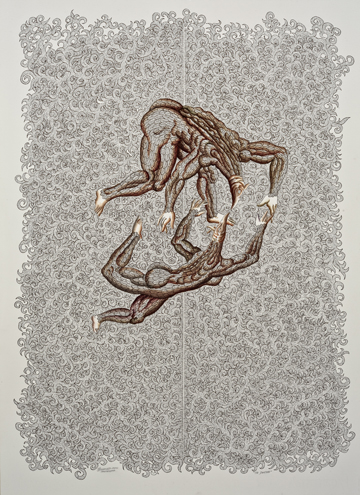 What really gave dimension to the dualistic painting was the unassuming presence of two child-like figures just before it’s looming presence. They sit innocently on what looks like a piece of drift wood. They welcome the viewer without confrontation, almost like a diorama, allowing us to ruminate over the depicted relationship and story. Who are these children? Survivors of the violence taking place behind them? Are they a portrayal of the artist or art-tourists standing before the work? Was this a collaboration gone wrong?